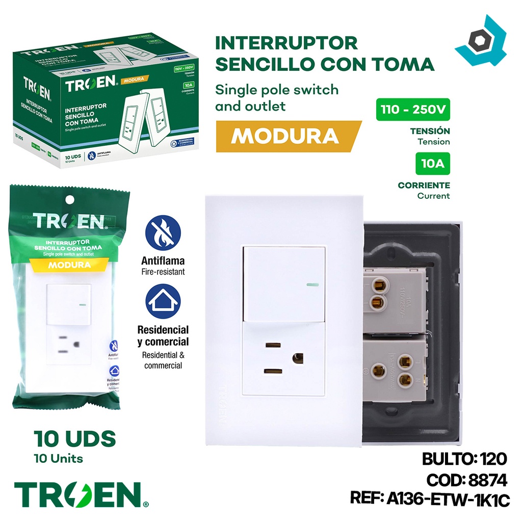 INTERRUPTOR MAS TOMACORRIENTE CON TIERRA COLOR BLANCO CORRIENTE 120V 10 AMP INCLUYE TORNILLOS ESTANDAR CUERPO DE NYLON-POLICARBONATO Y SOPORTE DE ACERO GALVANIZADO