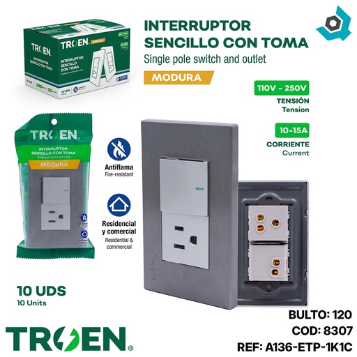APAGADOR SENCILLLO MAS TOMACORRIENTE CON TIERRA COLOR BLANCO INCLUYE TORNILLOS APGADOR PARA UNA SOLA LAMPARA O BOMBILLO ESTANDAR 120V-10A
