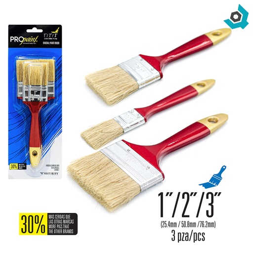 JUEGO DE BORCHAS 1", 2", 3" , 100% CERDAS, LAVABLES ,CASQUILLO NIQUELADO, UTLIZADO CON LATEX O PINTURA DE ACEITE, MANGO PLASTICO